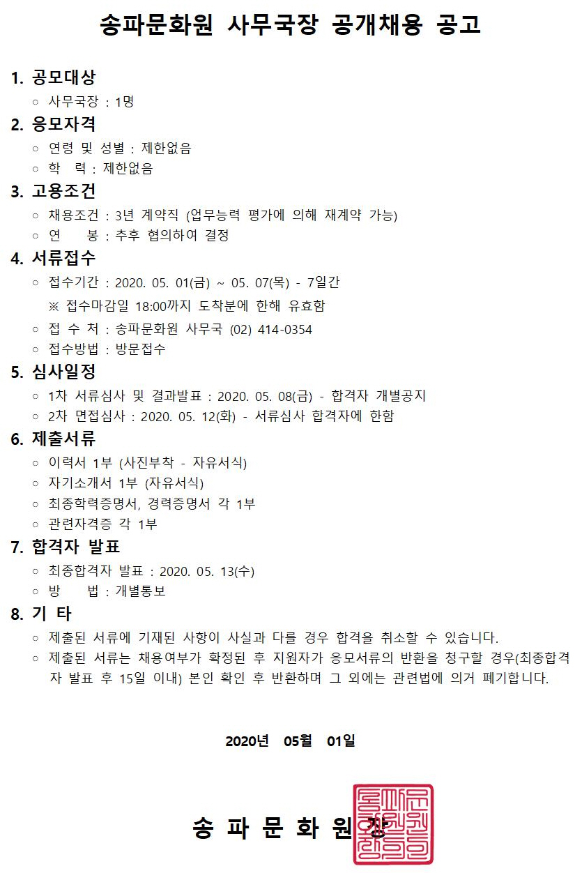 ¼ÛÆÄ¹®È­¿ø »ç¹«±¹Àå °ø°³Ã¤¿ë °ø°í!