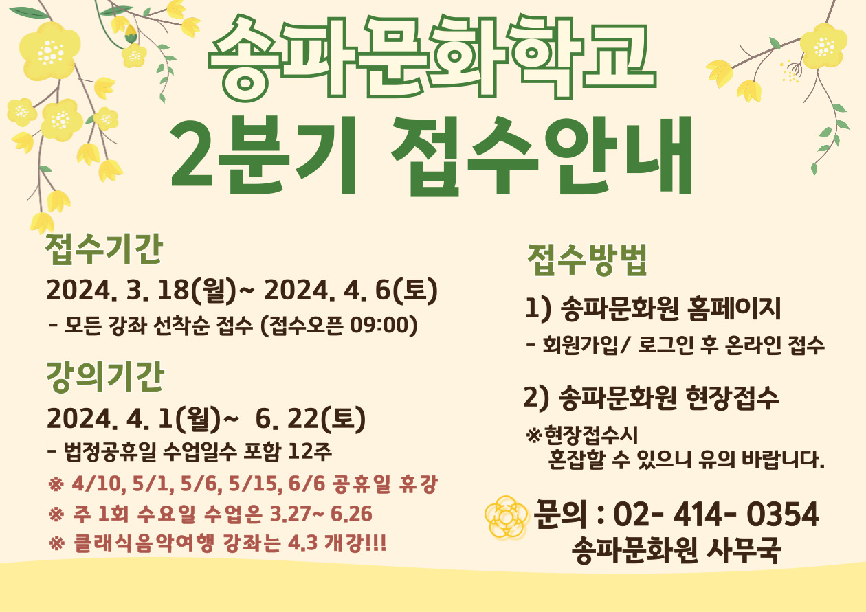✔ Á¢¼ö±â°£ : 2024.3.18(¿ù) ~ 2024.4.6(Åä), 09½ÃºÎÅÍ ¼±Âø¼ø ✔ °ÀDZⰣ : 2024.4.1(¿ù) ~ 06.22(Åä) ¡Ø ÁÖ 1ȸ ¼ö¿äÀÏ ¼ö¾÷Àº 3.27~6.26 ¡Ø Ŭ·¡½ÄÀ½¾Ç¿©Çà °Á´ 4.3 °³°!!! -¹ýÁ¤°øÈÞÀÏÀº ¼ö¾÷Àϼö¿¡ Æ÷ÇԵǸç, 12ÁÖ ¼ö¾÷ÀÌ ÁøÇàµË´Ï´Ù. -°ÀÇ Àοø ¹× ¹®È¿ø ³»ºÎ»çÁ¤¿¡ µû¶ó °ÀǽÇÀº Á¶Á¤µÉ ¼ö ÀÖ½À´Ï´Ù. -¼ö°»ýÀÌ 10¸í ¹Ì¸¸ÀÎ °Á´ Æó°µÉ ¼ö ÀÖ½À´Ï´Ù. (´Ü, °Á Ư¼º ¹× »çÁ¤¿¡ ÀÇÇØ Æó° ±âÁØÀº º¯°æµÉ ¼ö ÀÖÀ¸¸ç, Æó° ½Ã Àü¾× ȯºÒµË´Ï´Ù.)