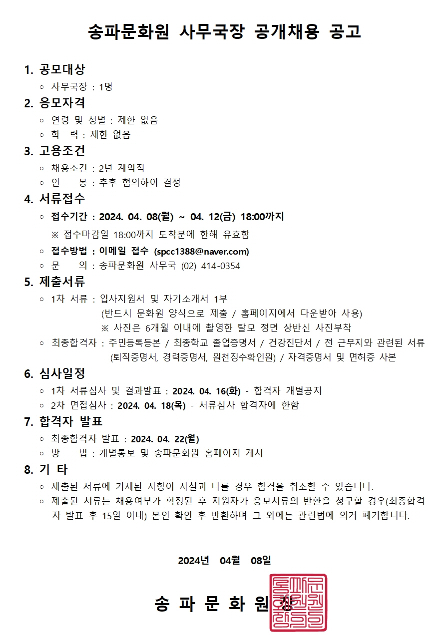 ¼ÛÆÄ¹®È¿ø »ç¹«±¹Àå °ø°³Ã¤¿ë °ø°í! |